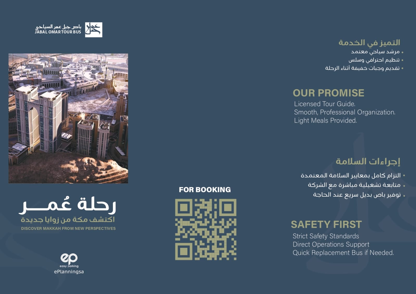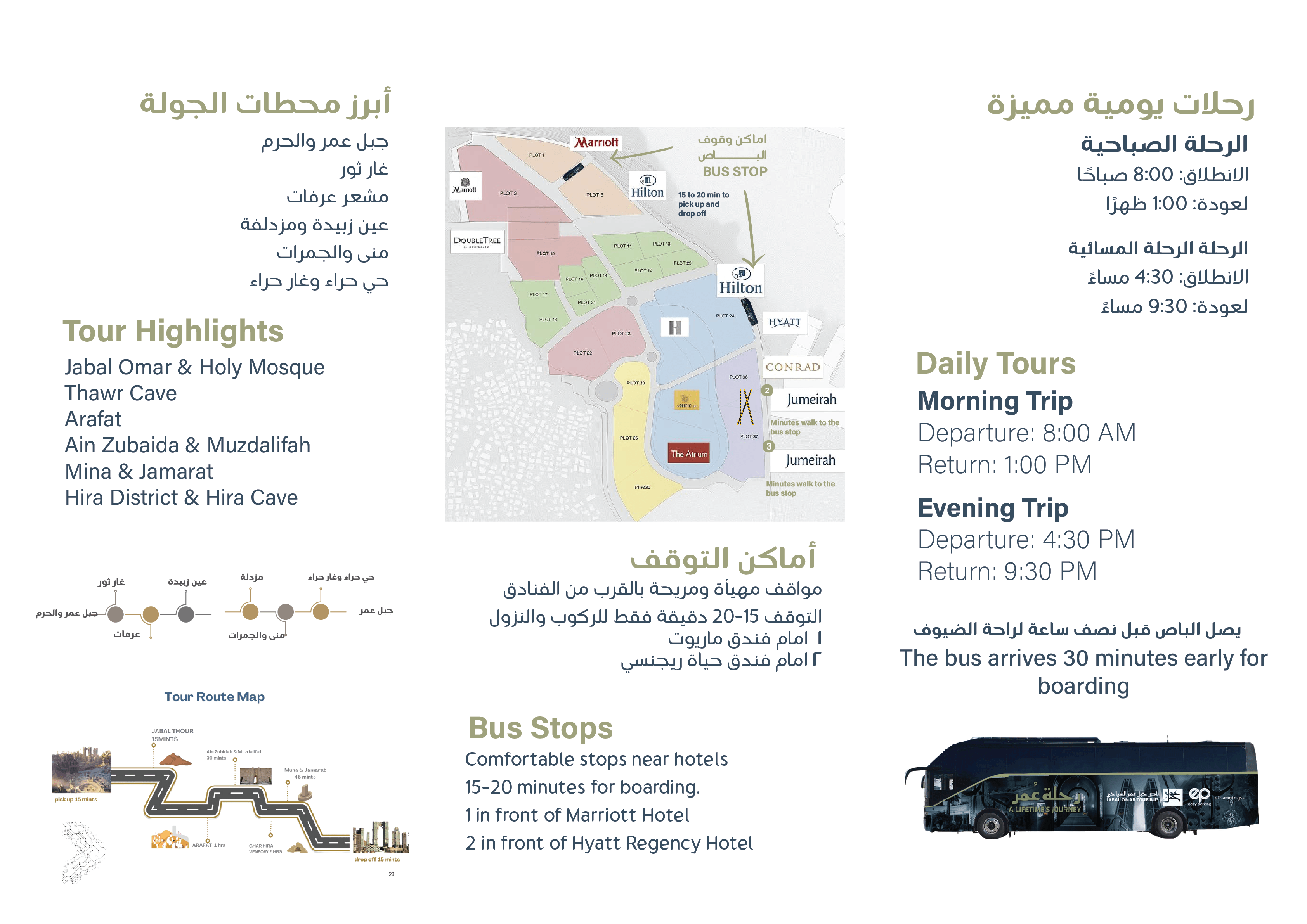 انطلق في جولة داخل مكة مدتها 5 ساعات، تبدأ من الفندق وتنقلك عبر باص مكيّف إلى أهم المعالم الدينية والتاريخية في مكة المكرمة. فريقنا يهتم بكل التفاصيل من الاستقبال وحتى نهاية الجولة، عشان تعيش تجربة مريحة، ثريّة، وممتعة.